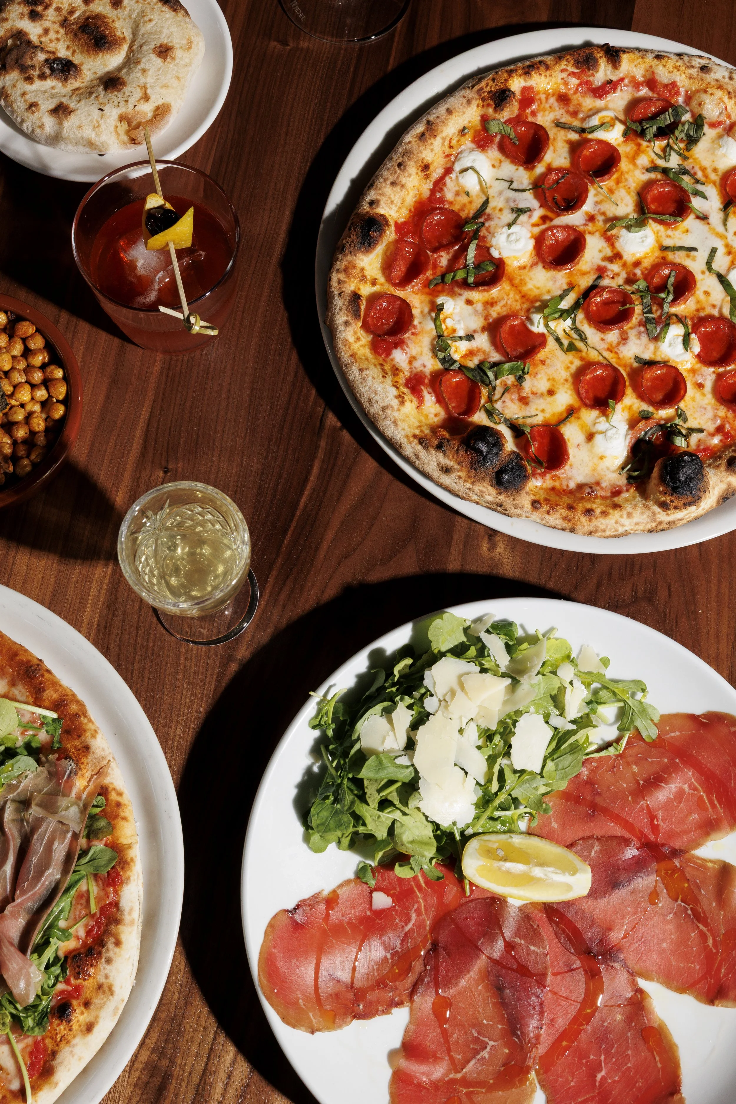 At the heart of the space is our centralized pizza bar with front-row views of the open kitchen and signature open-flame oven. Guests can also enjoy an intimate cocktail bar, a large communal table, comfortable banquet seating, and a welcoming outdoor patio.